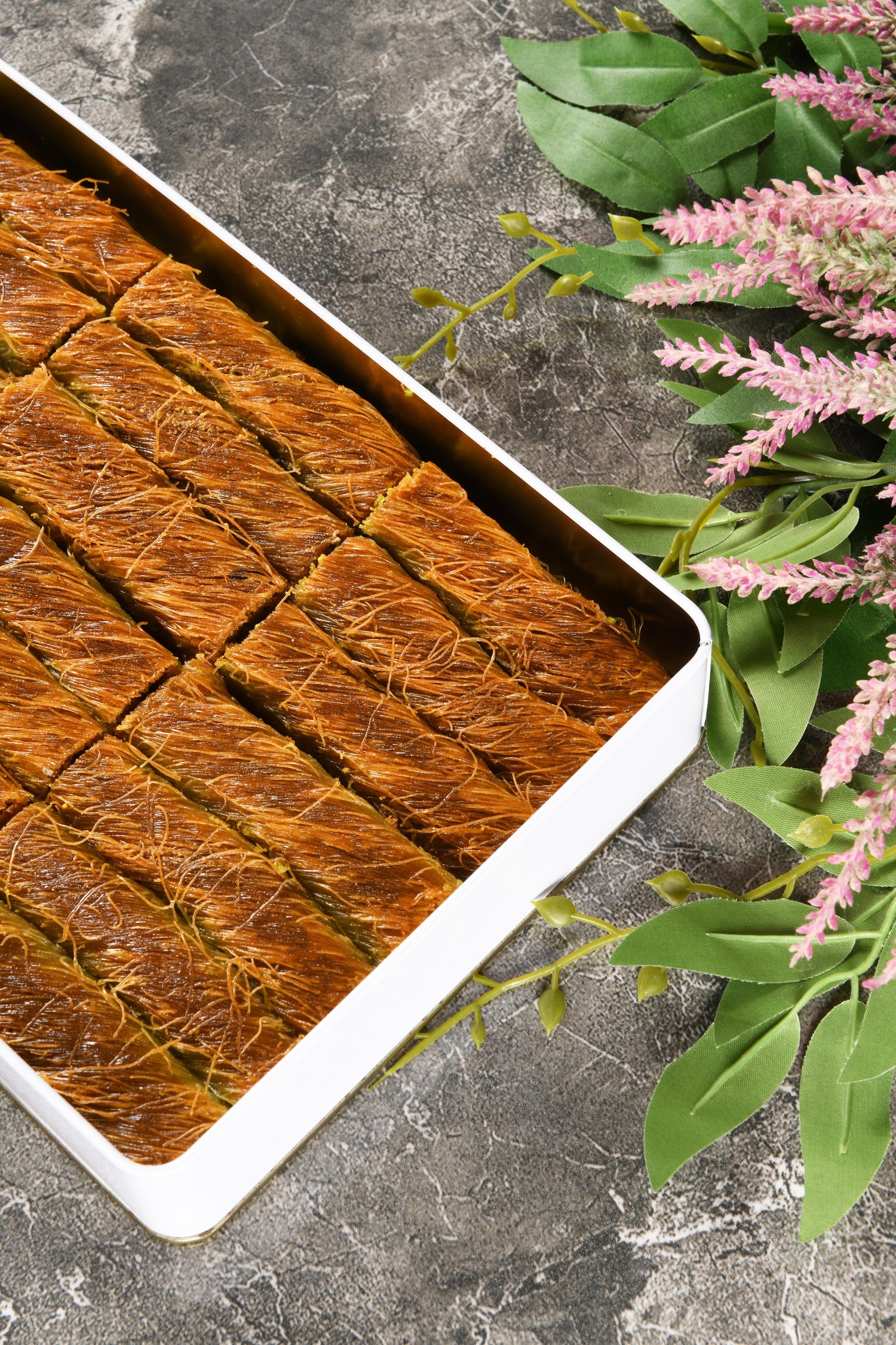 Ingredients (allergen warning): Special flour for kadayif, clarified butter (plain oil), sunflower oil, drinking water, salt, crystal granulated sugar, lemon juice, and pistachios (gray-green pistachios).