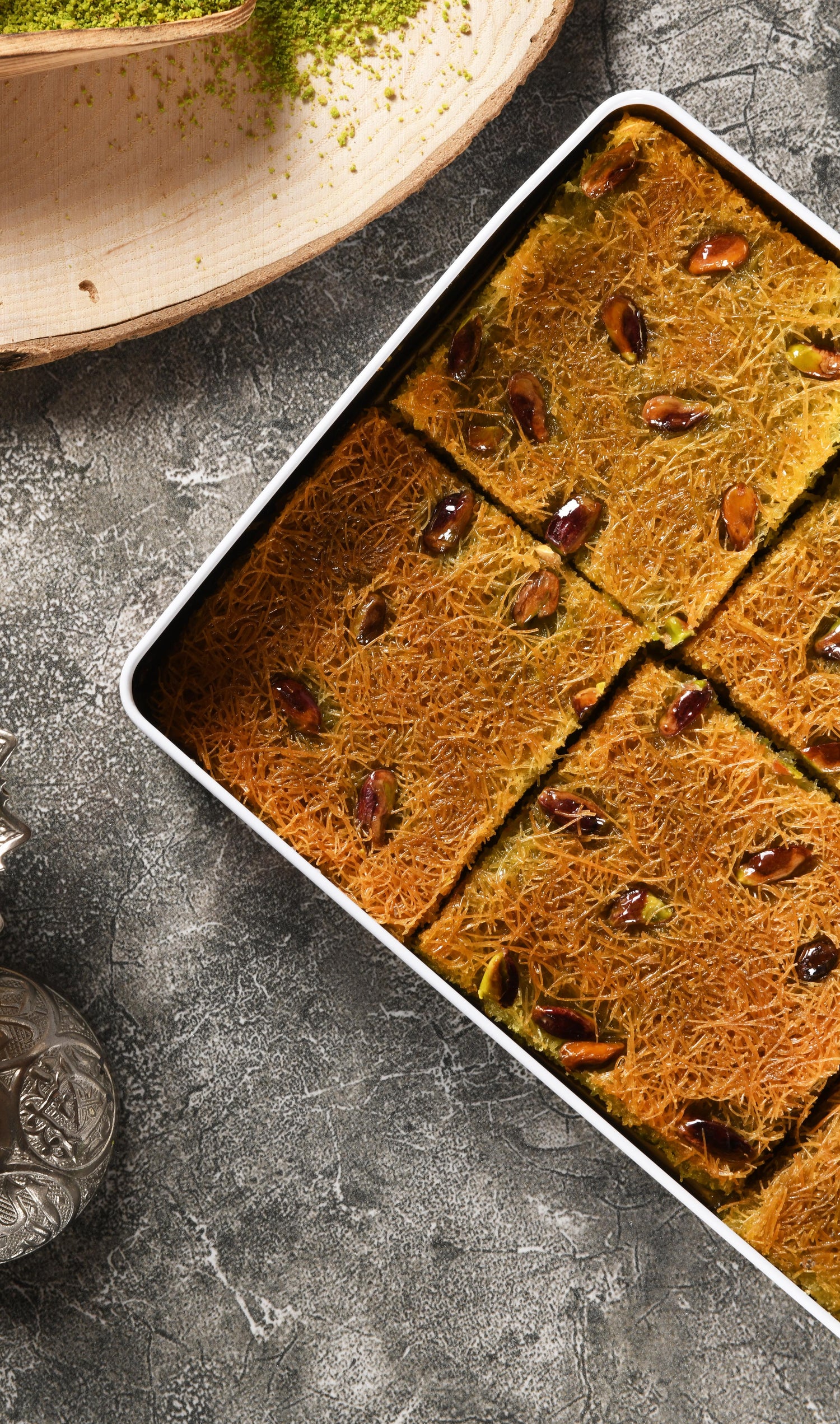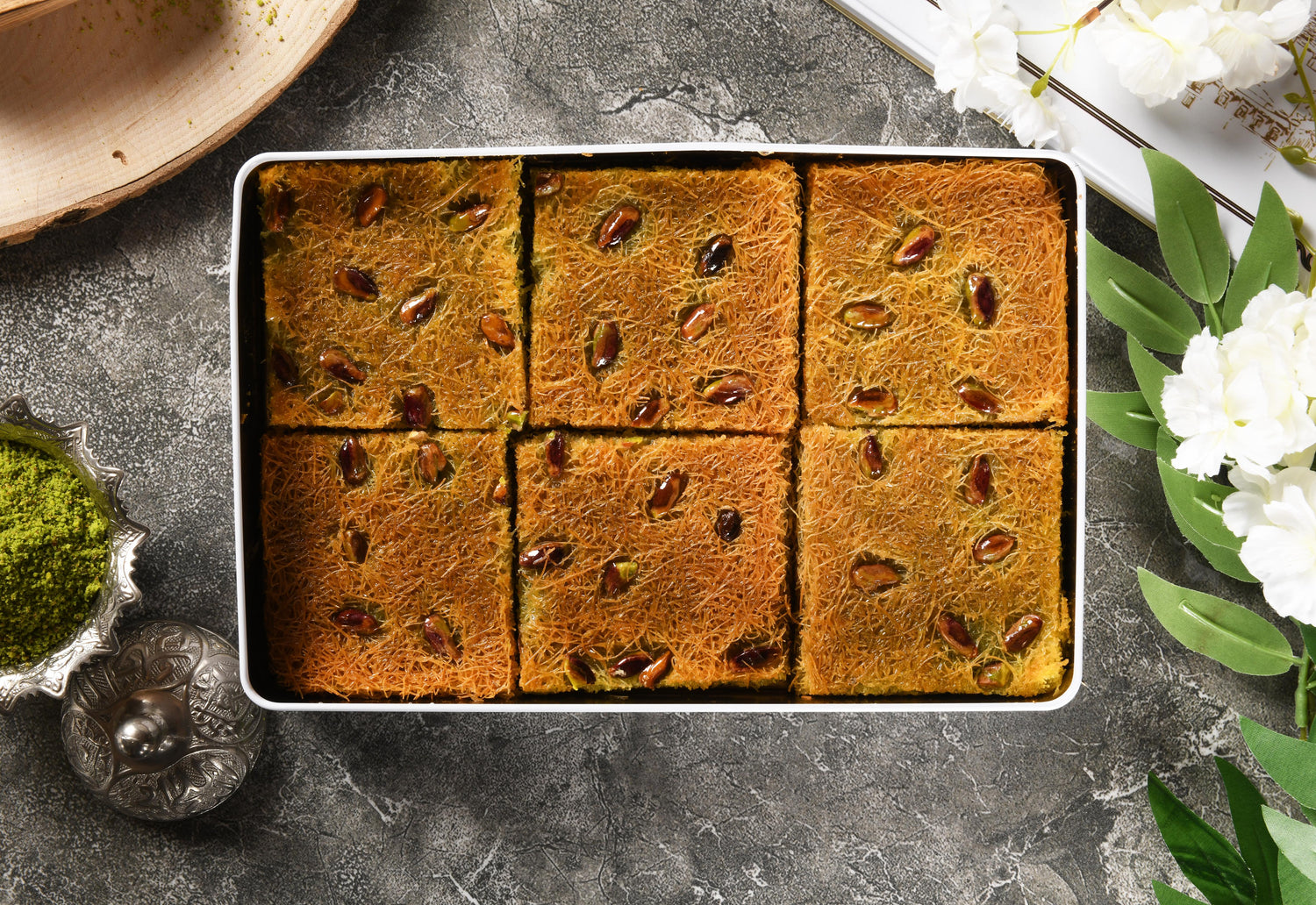 Ingredients (Allergen Warning): Our Pistachio Kadayif is made using special flour for kadayif, pure butter, sunflower oil, fresh drinking water, a pinch of salt, crystal granulated sugar, a hint of lemon juice, and premium pistachios sourced from the region.