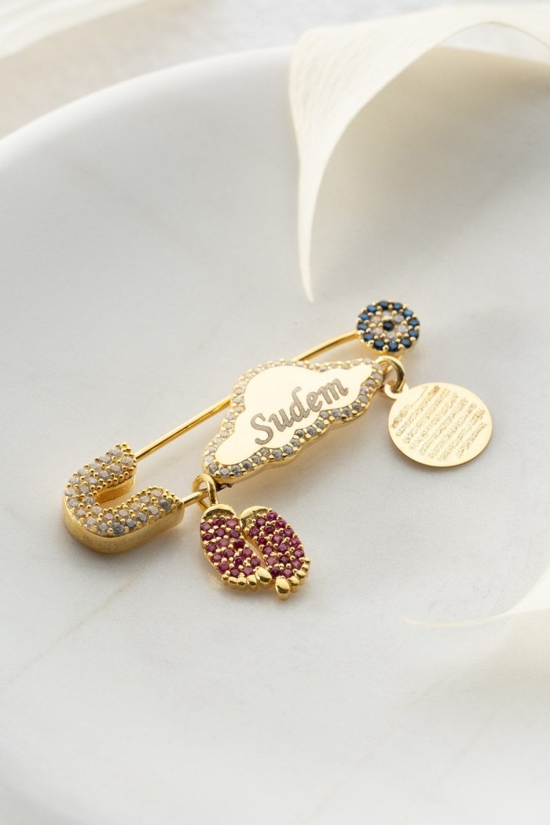 Nereze | Personalized Cloud Model Pink Feet Islamic Motivated Ayatal Kursi Baby Pin with Name