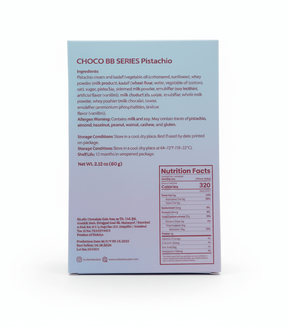 5. Trending Dessert Concept: Capitalize on the global popularity of Middle Eastern desserts and gourmet pistachio-filled chocolates. This bar is a guaranteed seller for ethnic grocers and mainstream retailers alike.